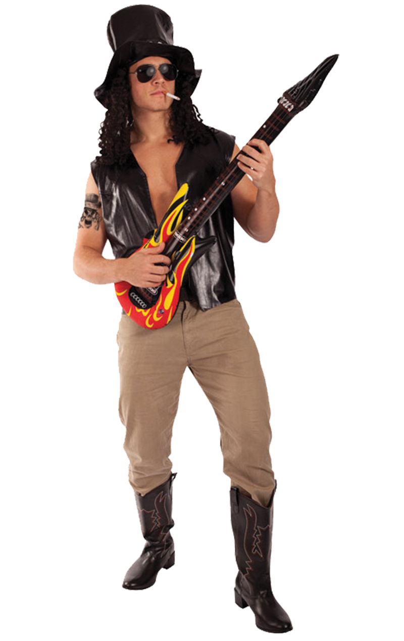 The Adult Guns n Roses Slash 1980s Costume comes complete with a leather-look sleeveless waistcoat, a black hat with attached hair, and a temporary tattoo transfer.