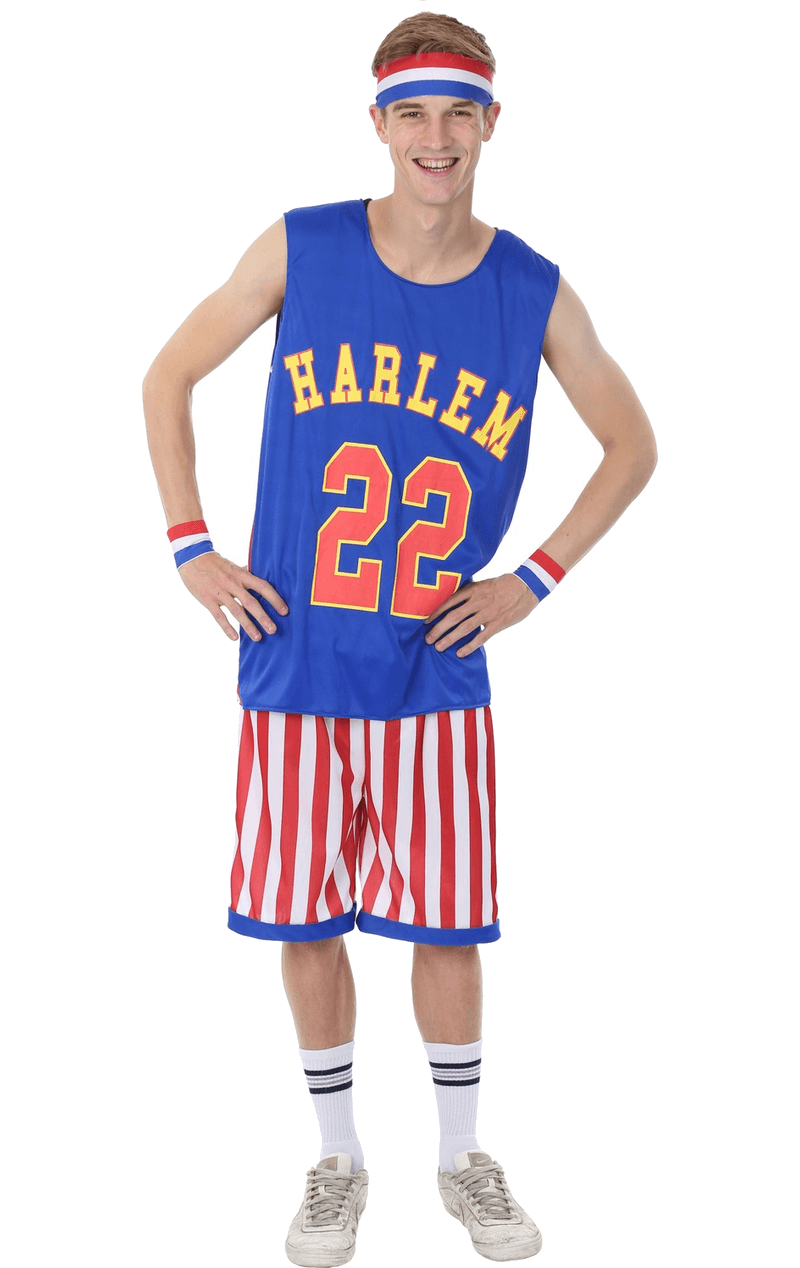 The Adult Harlem Globetrotters Costume comes complete with an electric blue tank top with the words ‘Harlem 22’ printed on the front. Also included are a pair of red and white striped shorts, a pair of red, blue and white wristbands, and finally, a matching headband to keep you cool.