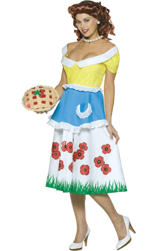 The Adult June 50s Costume with Cherry Purse is made up of an attractive low-cut midi dress, with an off the shoulder design. The top of the dress is yellow with white detailing and the skirt is white, with a beautiful red poppy and grass design printed along the bottom. A pale blue apron with white lace detailing is attached to the front of the dress and to complete the look, a homemade cherry pie is also included.
