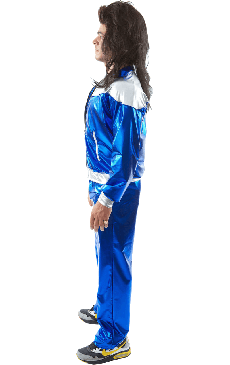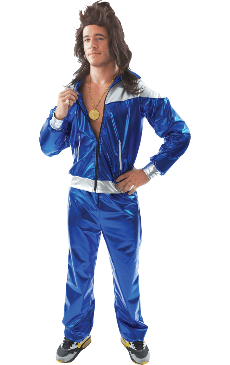 Dazzle the ladies with our blue and silver Adult Mens 1980s Shell Suit Costume, which has an eye catching metallic sheen. The outfit comes with a matching jacket and pair of trousers, with snazzy silver detailing throughout. Please note that the wig and the medallion aren’t included, but can be purchased separately if you’re looking to take your look to the next level.