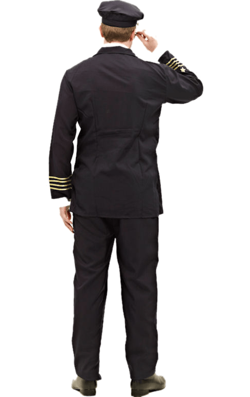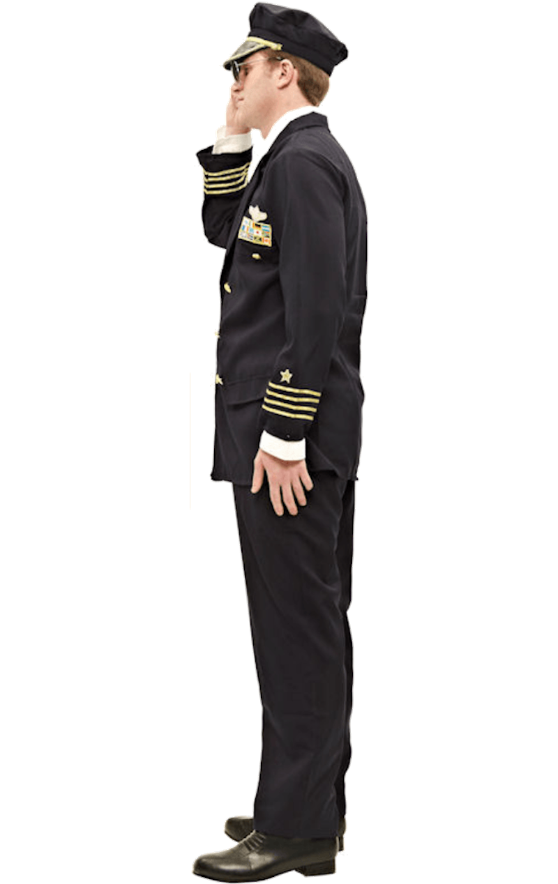 The Adult Pilot Costume is perfect for uniform and movie fancy dress. It features a black jacket with gold button detailing and stripes, an attached mock tie and shirt, a pair of black trousers, and finally, a pilot hat.