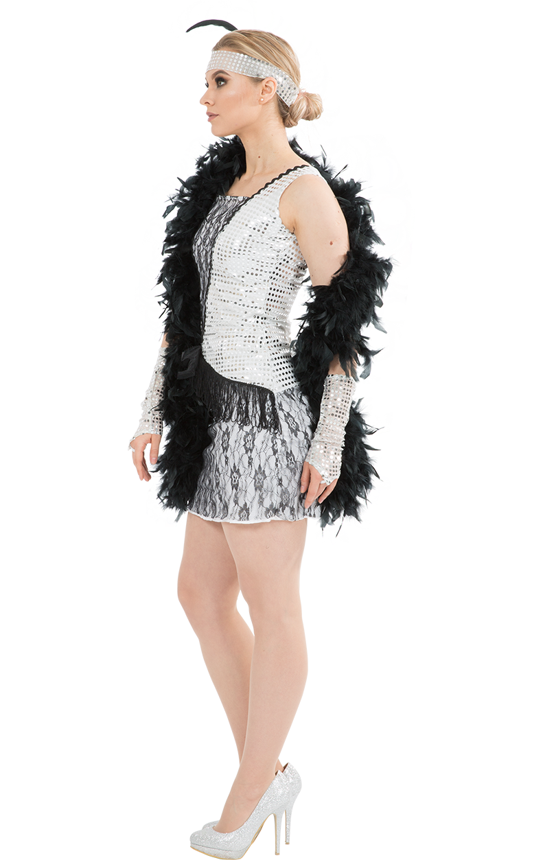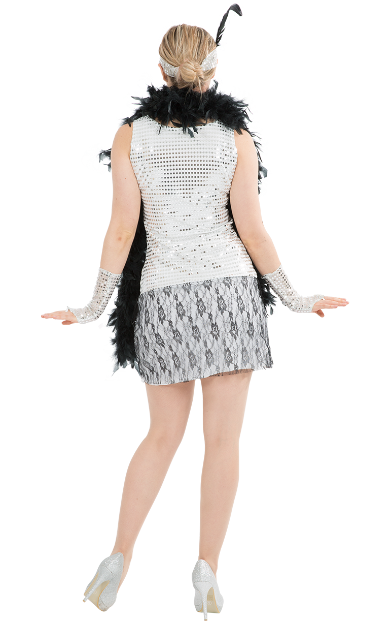 The flapper dress has gorgeous silver sparkling details, a netted waist bow, black lace panelling and a fringe section to swing when throwing out your best dance moves!