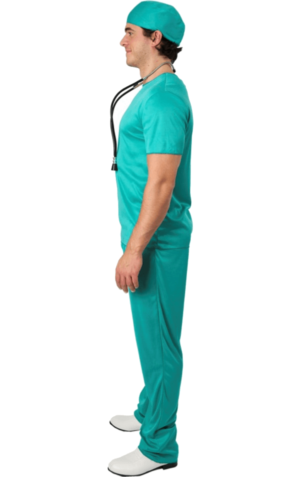 The Adult Surgeon Costume comes complete with an aqua blue long sleeved top and matching pair of trousers. To ensure your long curly locks don’t contaminate the operating room, a matching cap is also provided with the outfit.