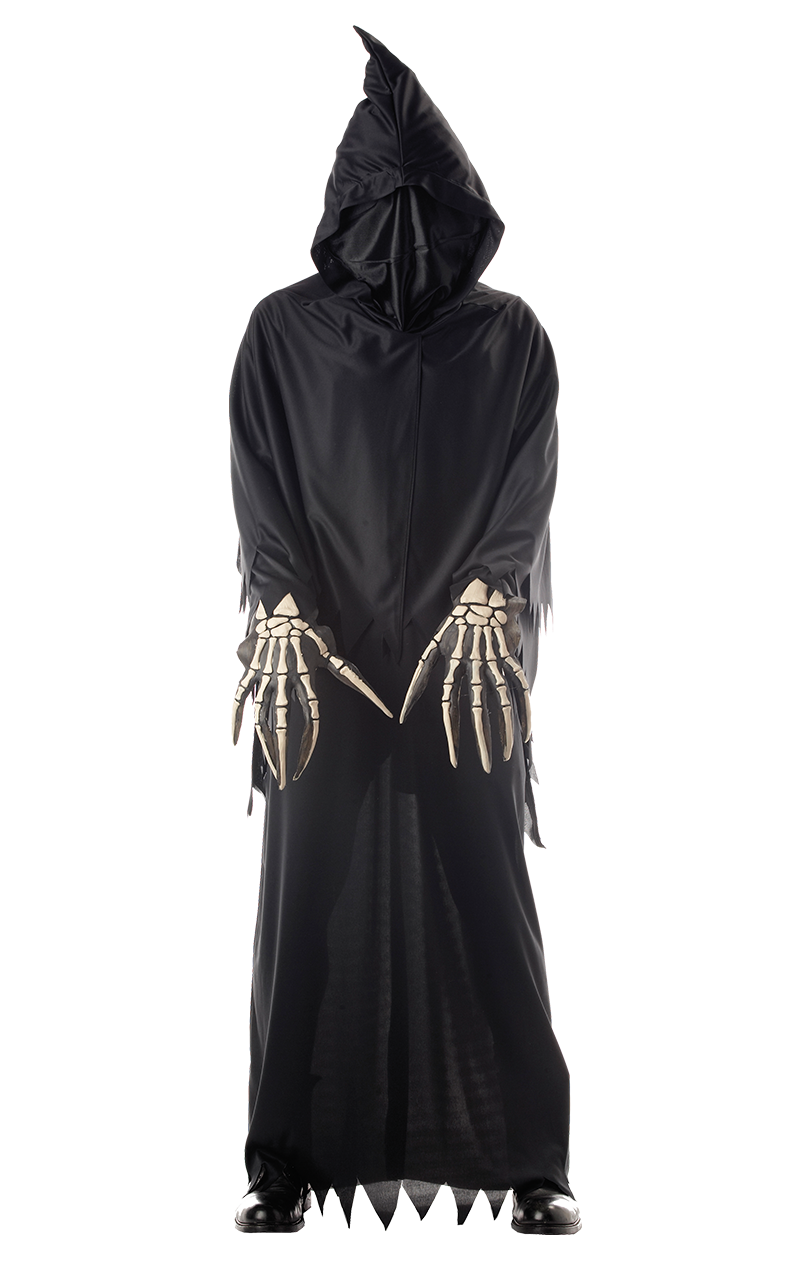 It comes with a frightening black Halloween hooded robe, complete with long, creepy skeleton hands.