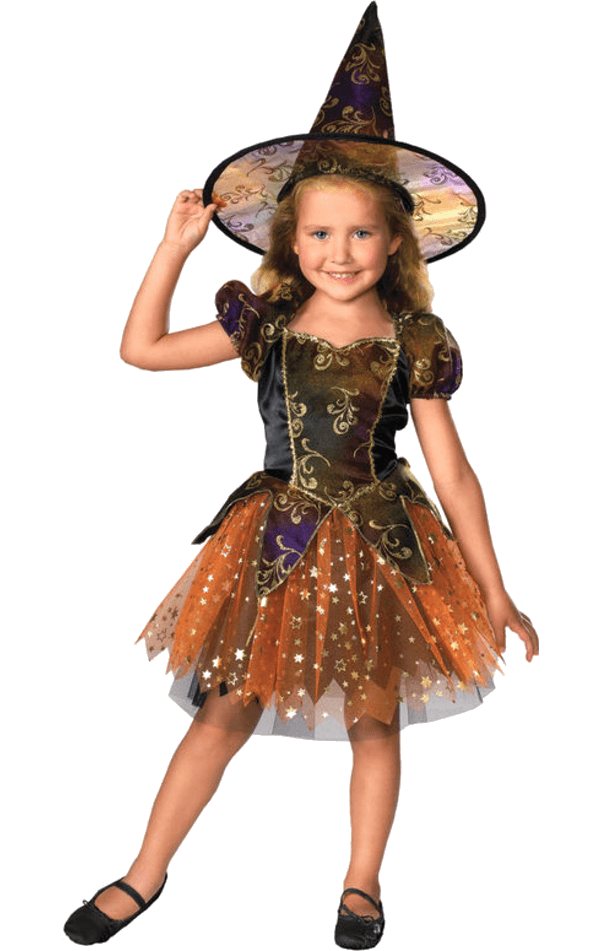The Childrens Sparkling Halloween Witch Costume includes a black, purple and orange dress decorated with gold swirls and gold stars on the skirt.