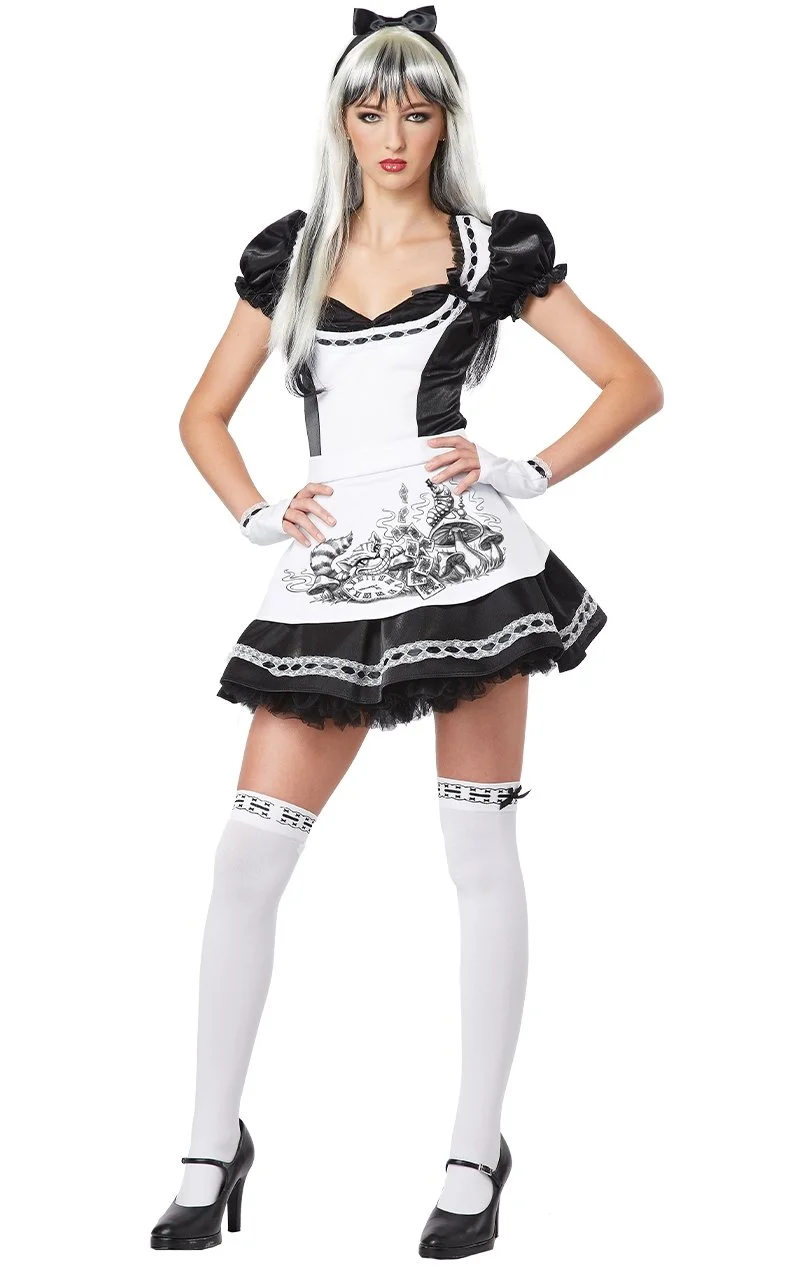 Turn this sweet and lovable story character into a twisted villain in this gothic black-and-white Alice in Wonderland dress with matching stockings and glovelettes.