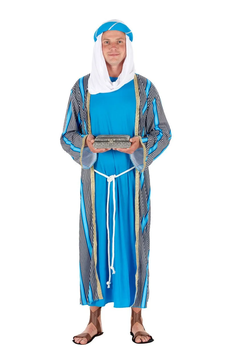 The Adult Three Wise Men Blue Costume comes complete with a bright blue, ankle-length caftan with a white rope belt. The costume also features gold, blue and black and white detailing on the sleeves. To complete the look, put on our blue and white headpiece and you’re set for the birth of baby Jesus. It’s a look that will transform you into Middle Eastern royalty in a matter of seconds!