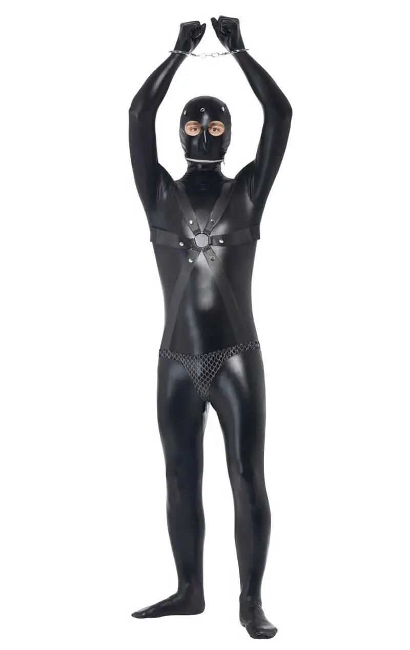 This Adult Gimp Costume is a shiny black bodysuit with black straps on the chest and a pair of chain mail pants that combine to give you a convincing gimp like appearance.