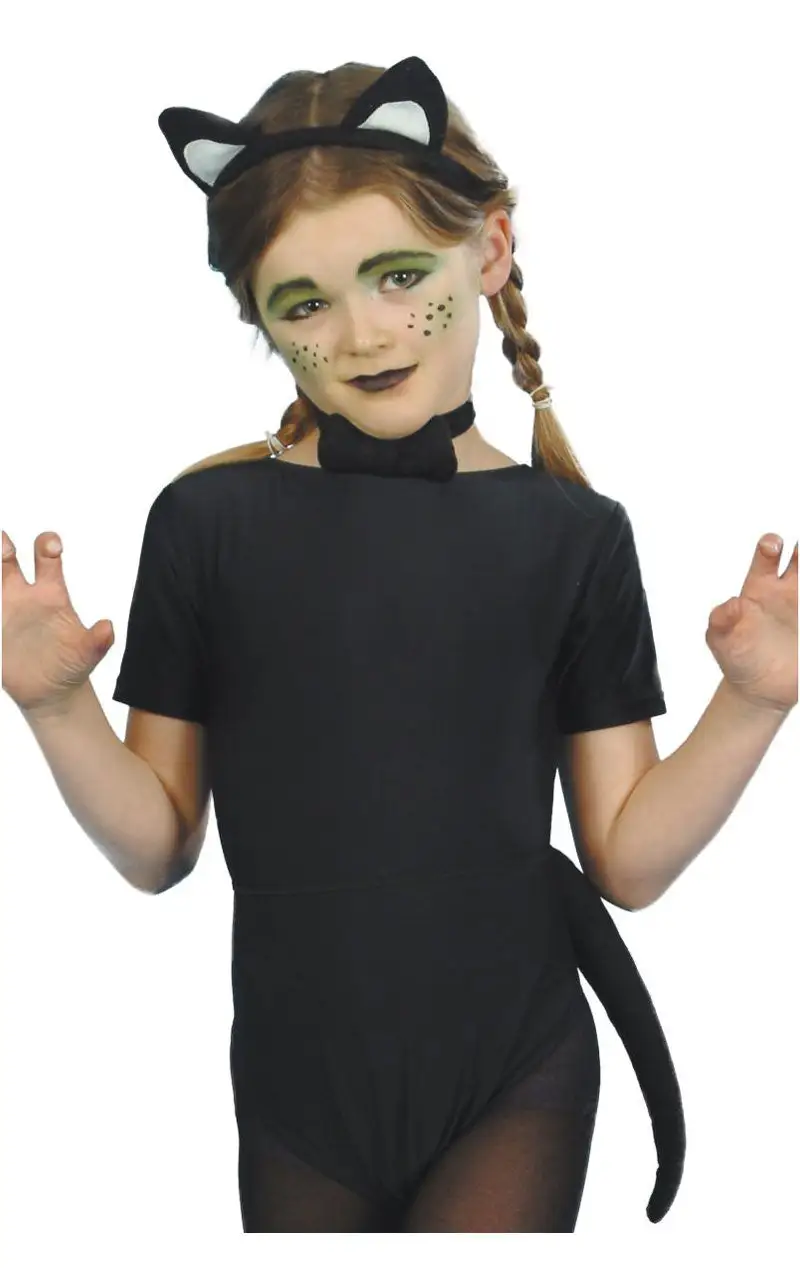 The Child Cat Set includes a pair of black and white ears on a headband, a black tail and a matching bow tie.