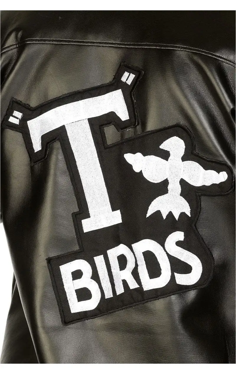 The licensed Child Official Grease T Bird Jacket is a child-size black faux leather jacket with an open front effect. It features an elasticated waistband and cuffs for comfort. The back has ‘”T”-BIRD’ and a bird symbol printed in white to recreate this classic look!