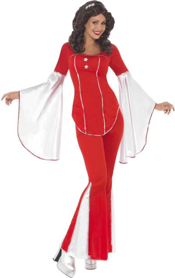 The Ladies’ Super Trooper Costume includes a pair of red and white trousers with flared legs and a coordinating top with bell sleeves, silver sequins and silver stars.