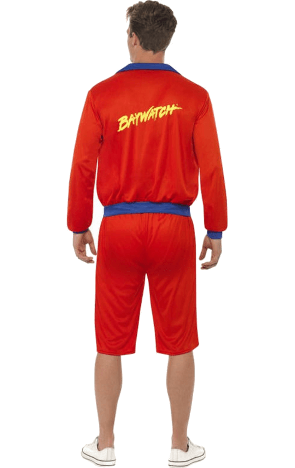 The Men’s Baywatch Costume includes a red zip-up jacket with a blue trim and Baywatch logos on the chest and back.
