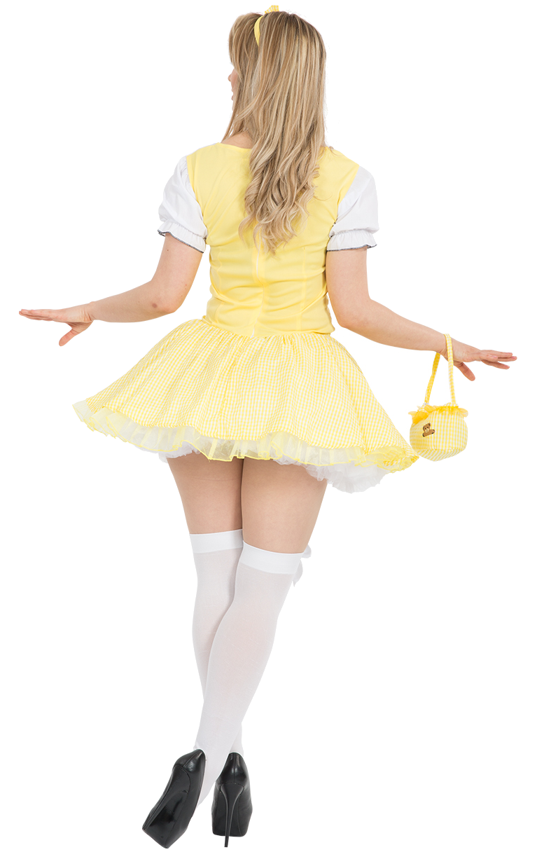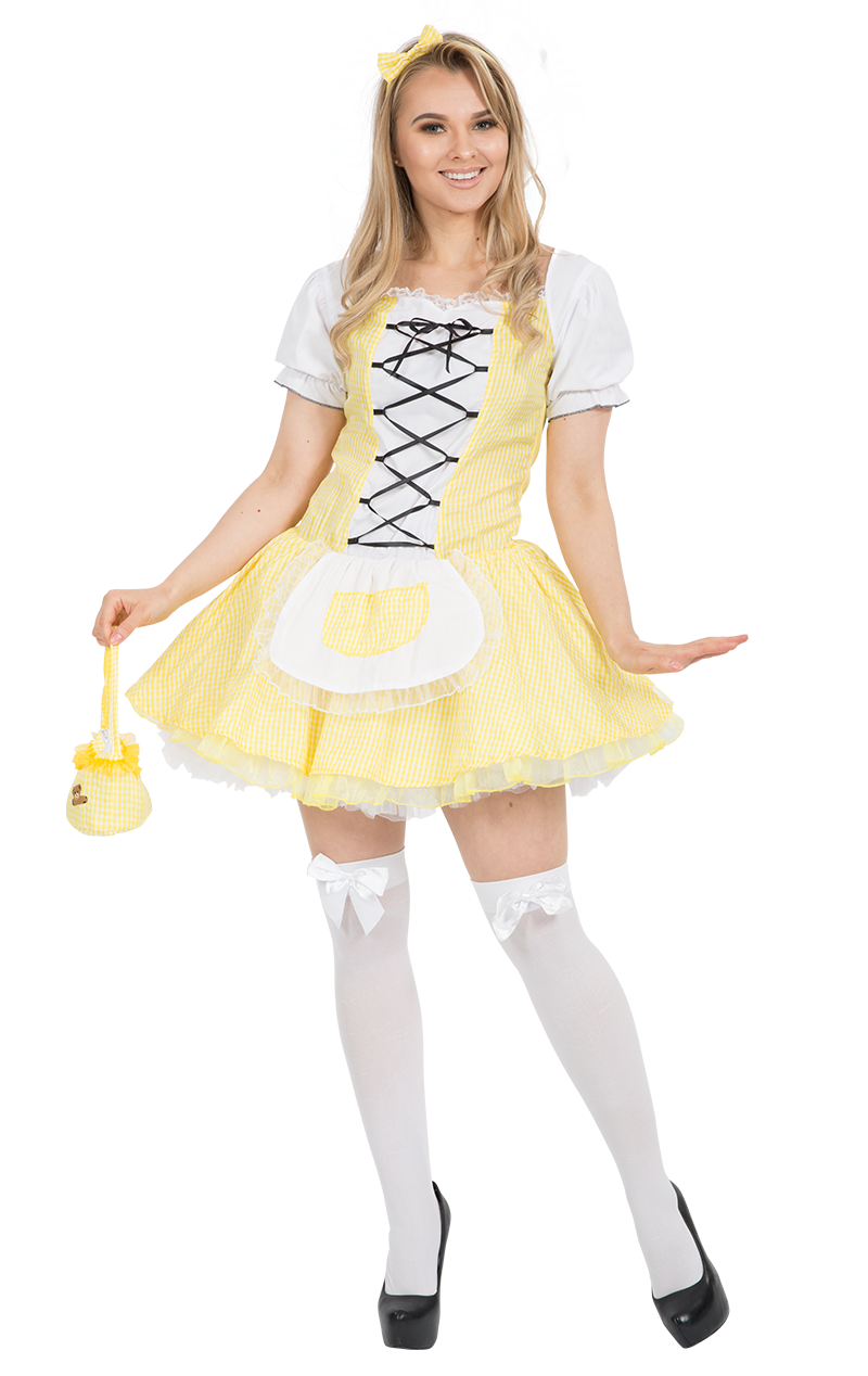 Inspired by the timeless tale of Goldilocks and the Three Bears, this wonderfully detailed outfit is a yellow and white gingham dress with an attached white blouse and a white apron at the front with lace trim.