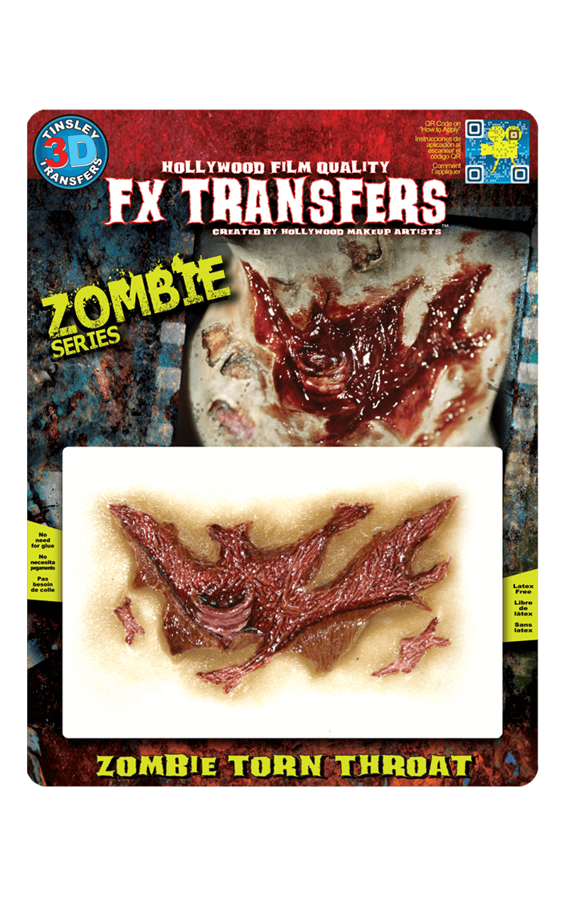Complete your gory zombie look this Halloween with this stomach turning Zombie Torn Throat FX Transfer. This realistic decaying skin patch even has an exposed bloody windpipe to really freak everyone out, how gross! This transfer is so easy to apply, all you need is a little water and it will stay put all day and all night. Created by leaders in the special effects makeup industry, this impressive transfer will sicken and disgust your friend, ensuring you are the freakiest zombie this Halloween.